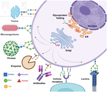 Glycosylation is one of the most common post-translational modifications. Despite recent developments in experimental methods such as X-ray crystallography, NMR and cryo-electron microscopy, it remains challenging to study the structures and dynamics of glycans because of their inherent flexibility and their chemical heterogeneity. The existing gaps in our knowledge regarding glycan conformational dynamics could be filled by molecular simulation approaches if the biophysical and physicochemical properties of the glycans are accurately represented by the underlying forcefield, which describes the energies and forces within the system of interest. In this work, we have extended an existing pseudo-atomic coarse-grained forcefield towards the simulation of glycans. Parameters for the physiologically most relevant N-glycans and glycosaminoglycans were tuned to ensure accurate adoption of local/global properties, aggregative behavior and binding affinities. Later, the developed models were used for investigating the role of glycan roles in the oligomerization of heavily glycosylated epidermal growth factor receptor.