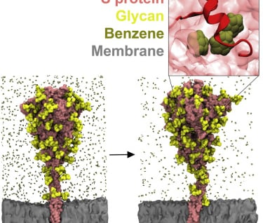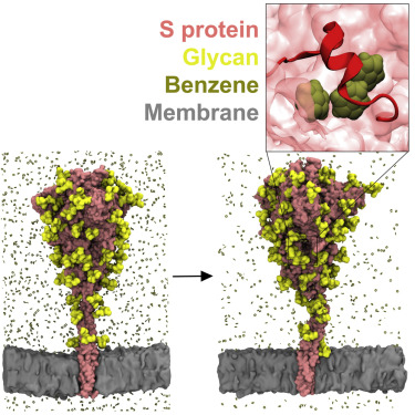 The COVID-19 pandemic has prompted a rapid response in vaccine and drug development. Herein, we modeled a complete membrane-embedded SARS-CoV-2 spike glycoprotein and used molecular dynamics simulations with benzene probes designed to enhance discovery of cryptic pockets. This approach recapitulated lipid and host metabolite binding sites previously characterized by cryo-electron microscopy, revealing likely ligand entry routes, and uncovered a novel cryptic pocket with promising druggable properties located underneath the 617–628 loop. A full representation of glycan moieties was essential to accurately describe pocket dynamics. A multi-conformational behavior of the 617–628 loop in simulations was validated using hydrogen-deuterium exchange mass spectrometry experiments, supportive of opening and closing dynamics. The pocket is the site of multiple mutations associated with increased transmissibility found in SARS-CoV-2 variants of concern including Omicron. Collectively, this work highlights the utility of the benzene mapping approach in uncovering potential druggable sites on the surface of SARS-CoV-2 targets.